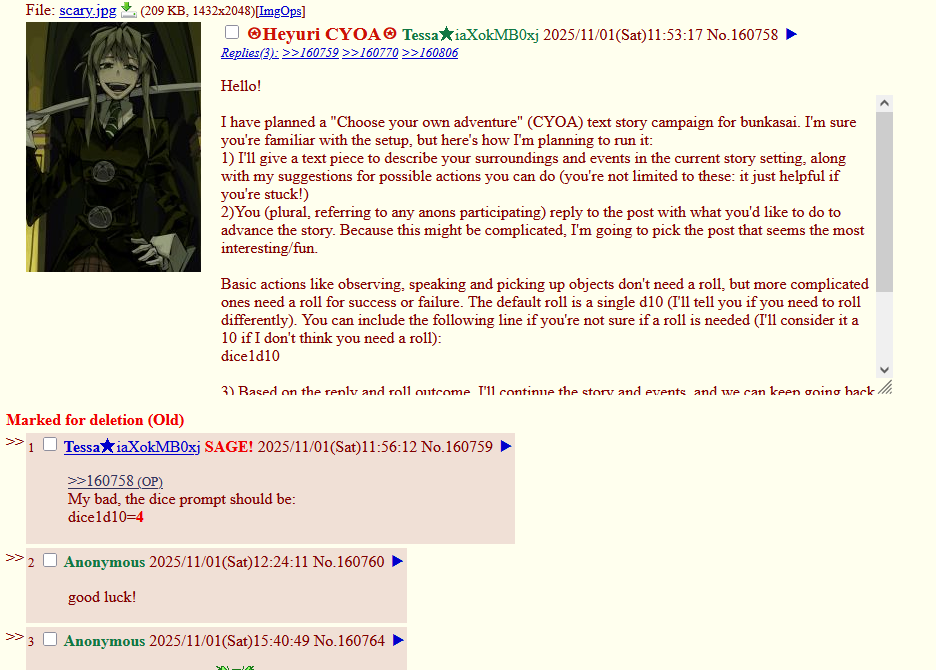 A "Choose your own adventure" (CYOA) text story campaign. The activity made use of the newly added dice rolling feature on Kokonotsuba.