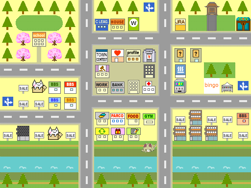 A virtual town/life sim/RPG where players can develop their characters, get jobs, play minigames, buy/win stuff, build houses in the towns (bulletin boards/stores), compete with other towns, form relationships, get married, raise kids, and moar.